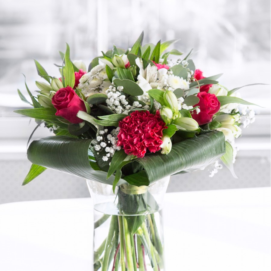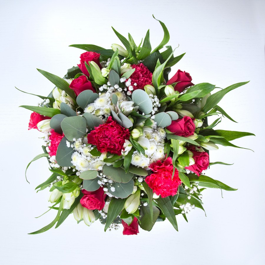Celebrate beauty with our charming bouquet, a perfect blend of creativity and elegance. This unique arrangement features luscious red roses and carnations paired with sweet white chrysanthemums and gypsophila, enhanced by white alstroemeria and aspidistra foliage.